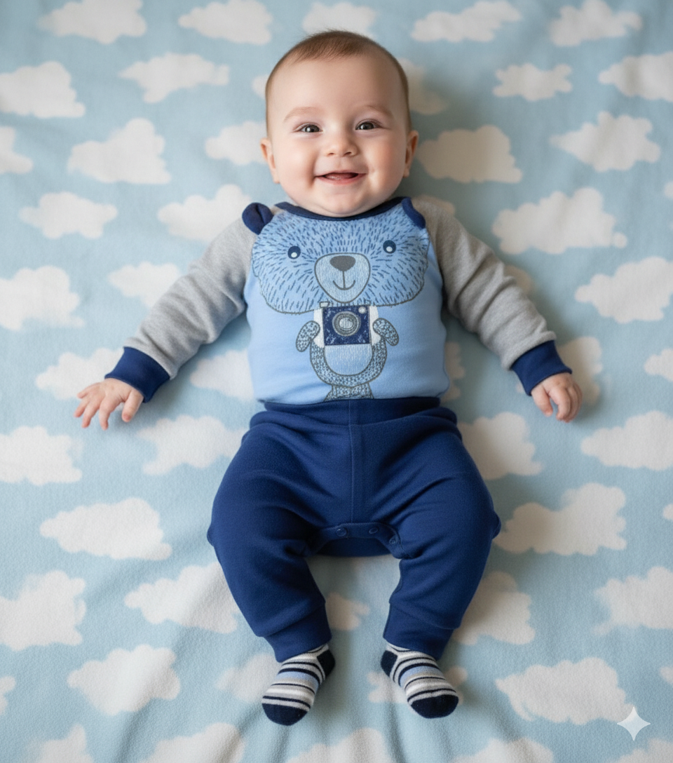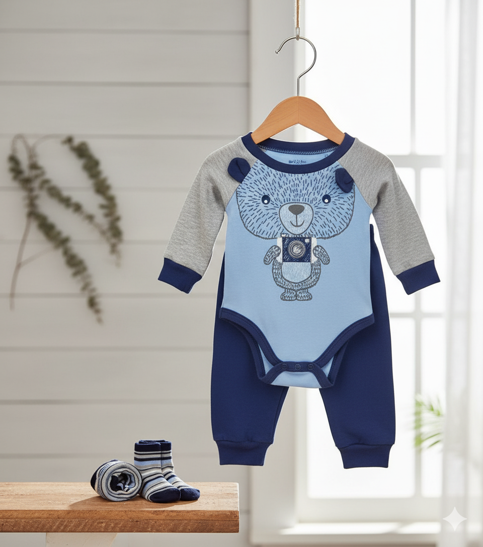- 1 Bodysuit + 1 Trouser + 1 Socks Set