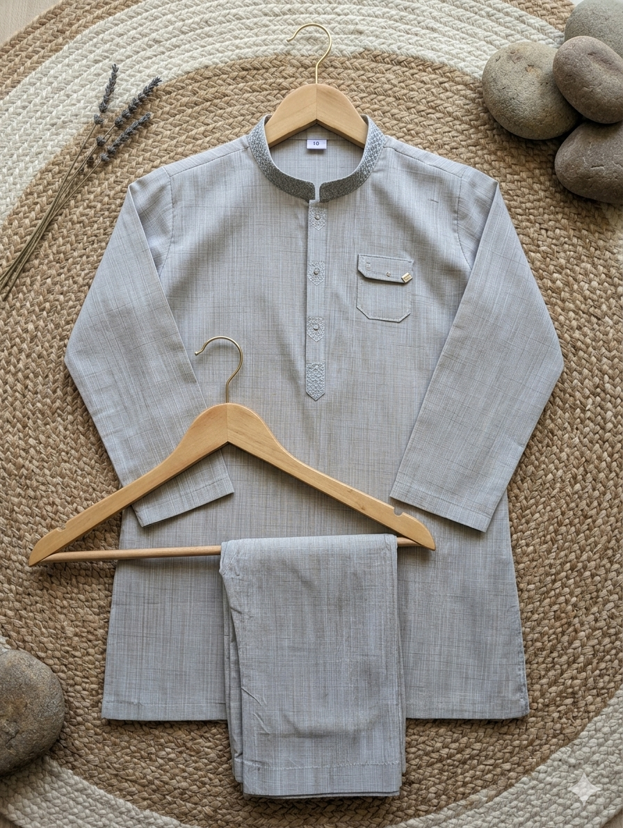 Give your young gentleman a look of refined elegance with this exquisite kurta set from 0092Store. This meticulously designed two-piece outfit is crafted to blend traditional Pakistani style with a modern, clean aesthetic, making it a perfect addition to his wardrobe.