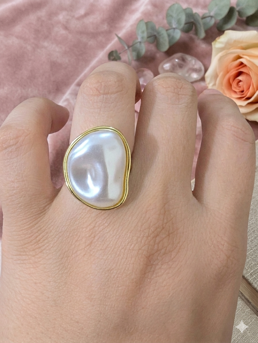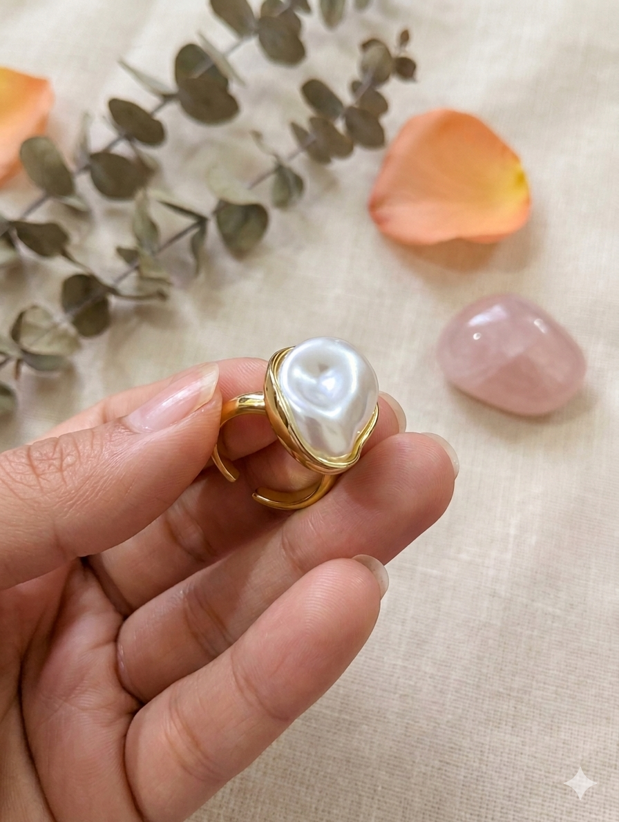 Elevate your jewelry collection with the timeless elegance of our Baroque Pearl Statement Ring. Featuring a lustrous, uniquely shaped cultured pearl cradled in a molten-style 18k gold-plated setting, this piece perfectly balances raw natural beauty with modern sophistication.