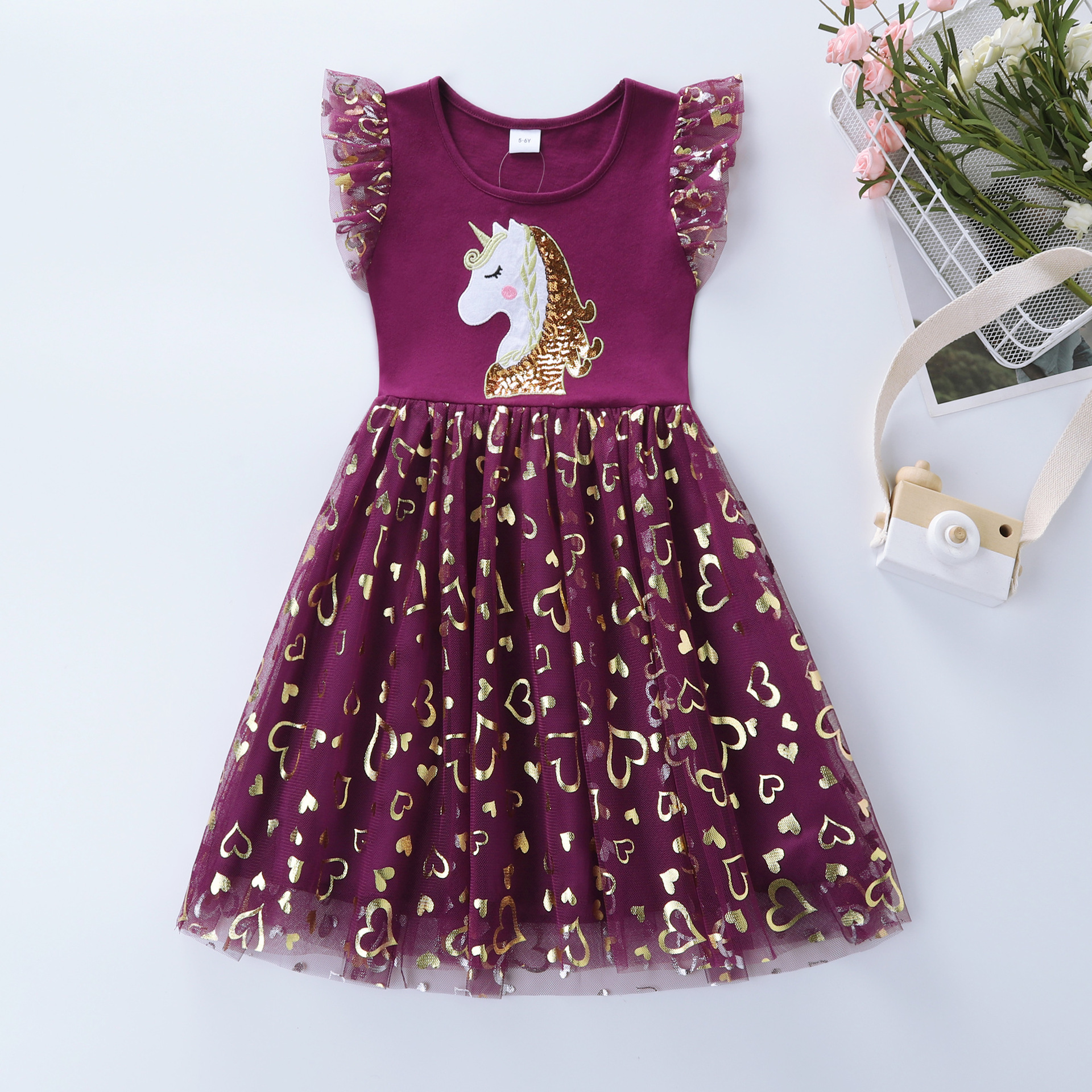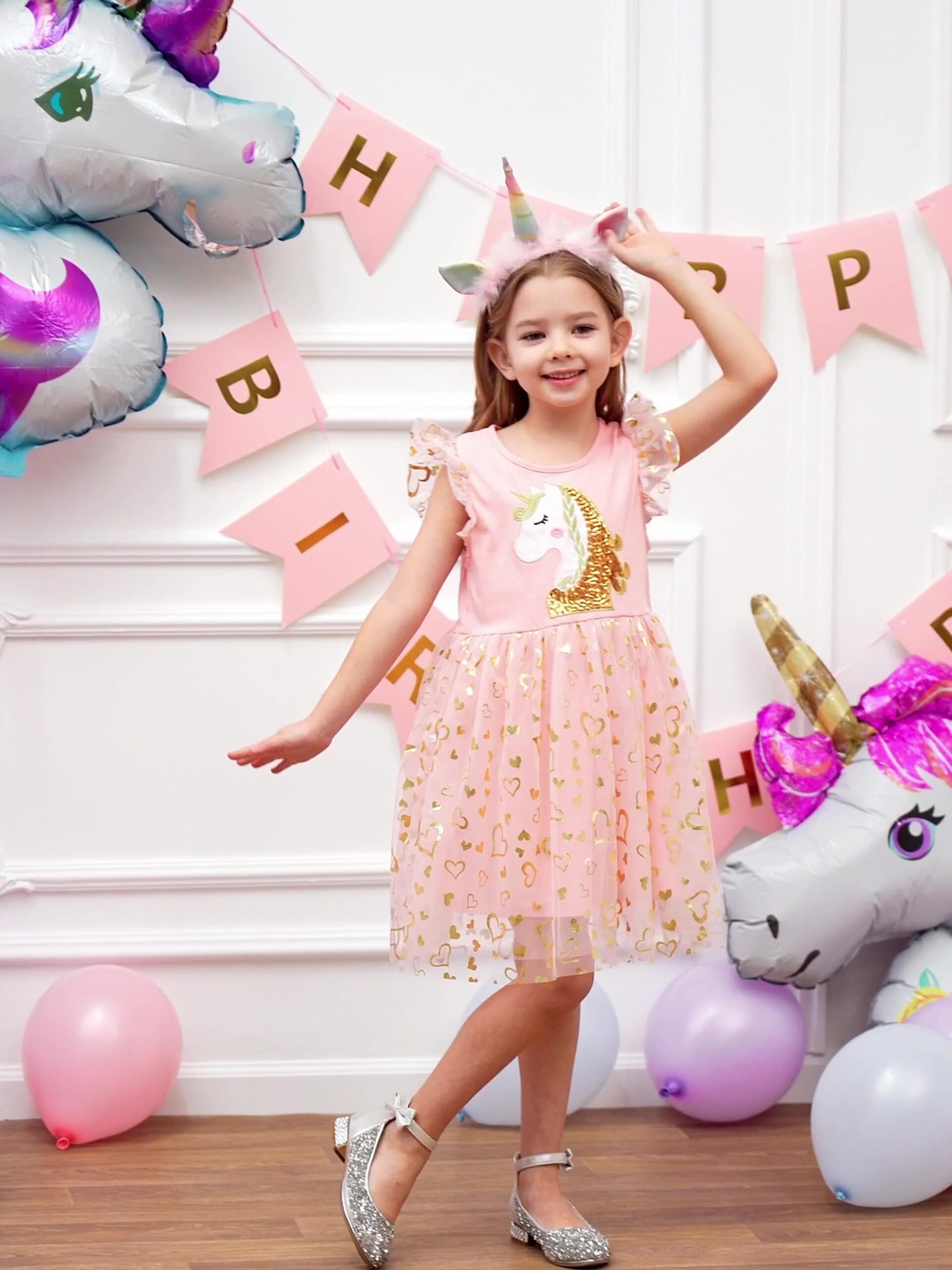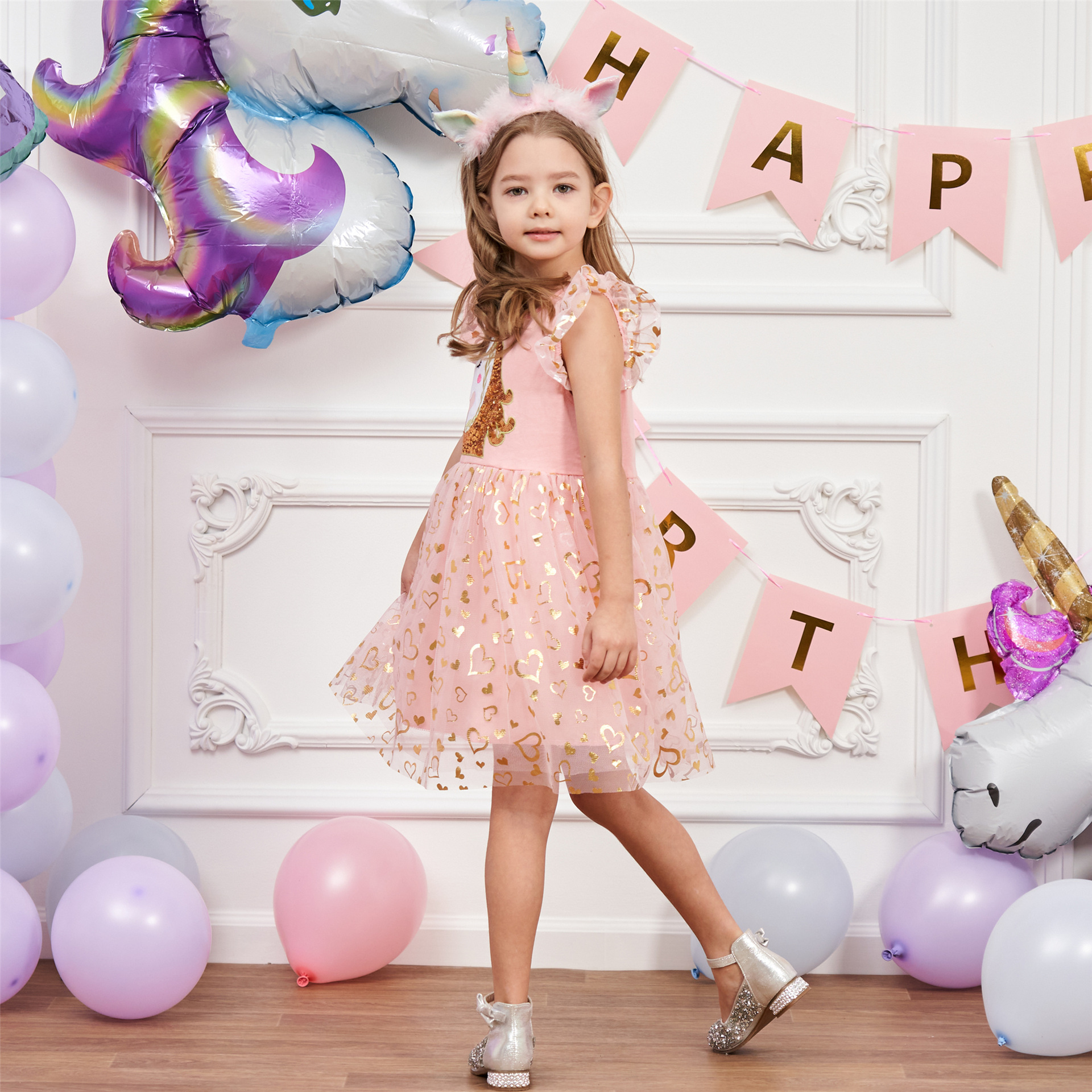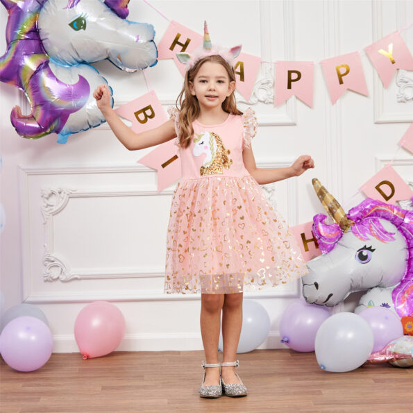 Cute Pink Glittery Hearts Sequenced Unicorn Head Net Frock