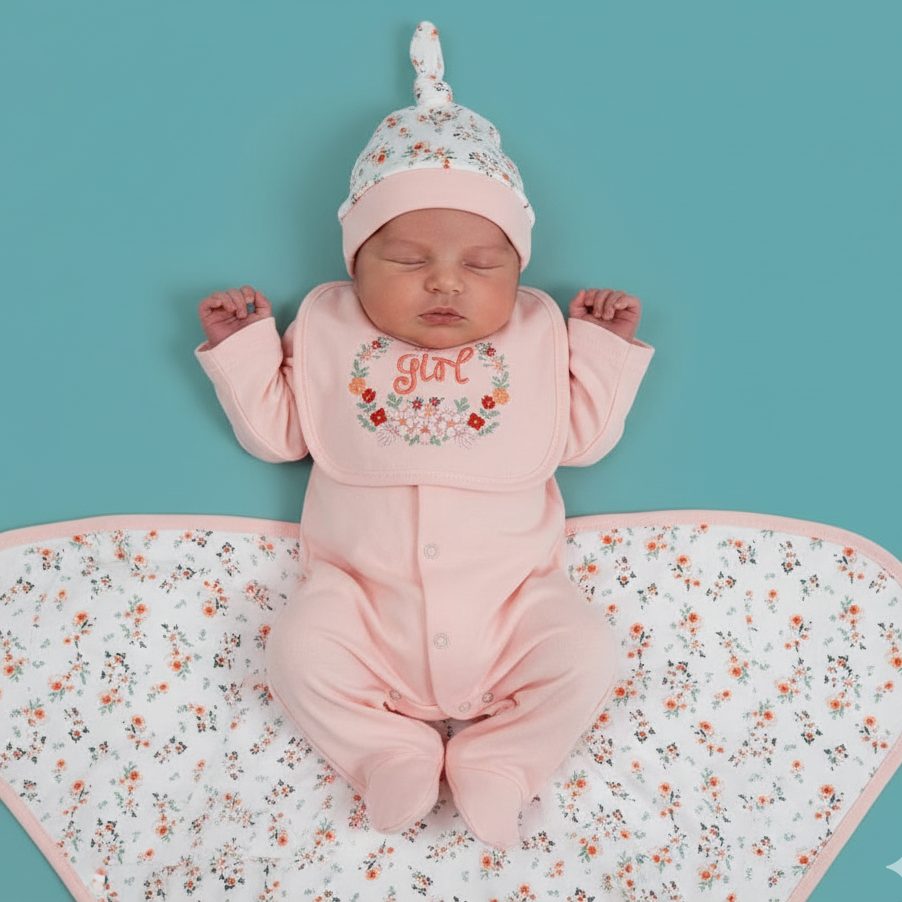 This beautiful set features a floral printed theme with soft pink tones, giving your baby a charming and elegant look. Ideal for newborn babies, it makes a perfect gift for baby showers, hospital use, and first photoshoots.