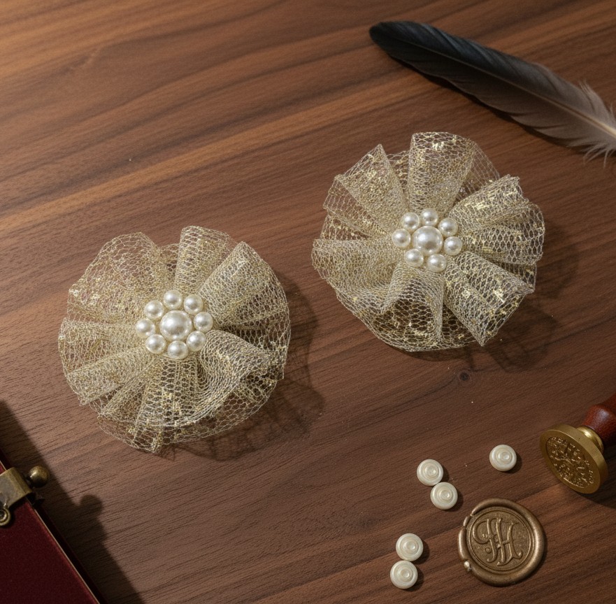 Add a touch of elegance and charm to your hairstyle with our Golden Pearl Mesh Hair Pins. Crafted with soft, shimmery net fabric in dreamy Golden , each clip features a delicate cluster of pearls at the center — giving it a classy yet playful look.