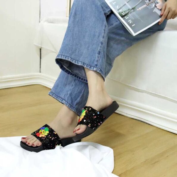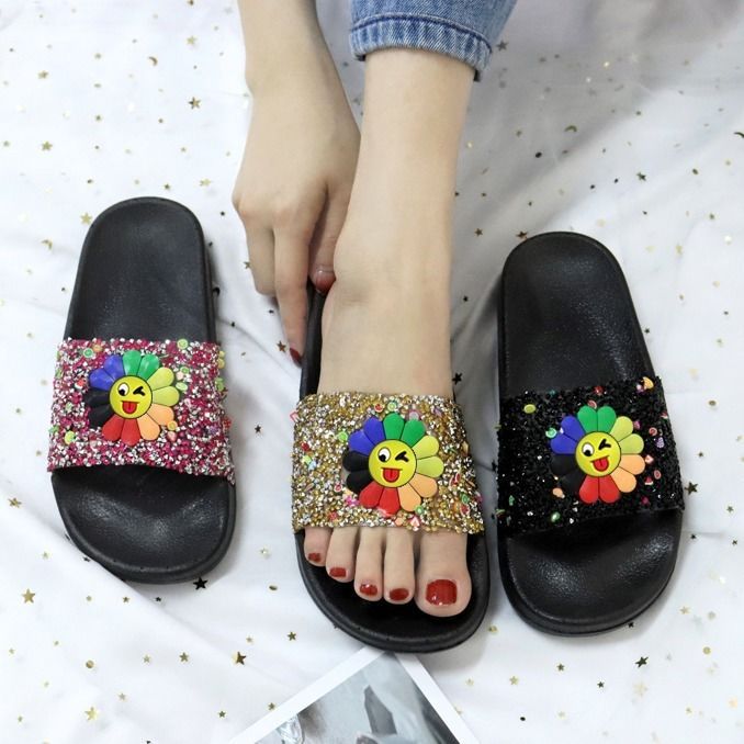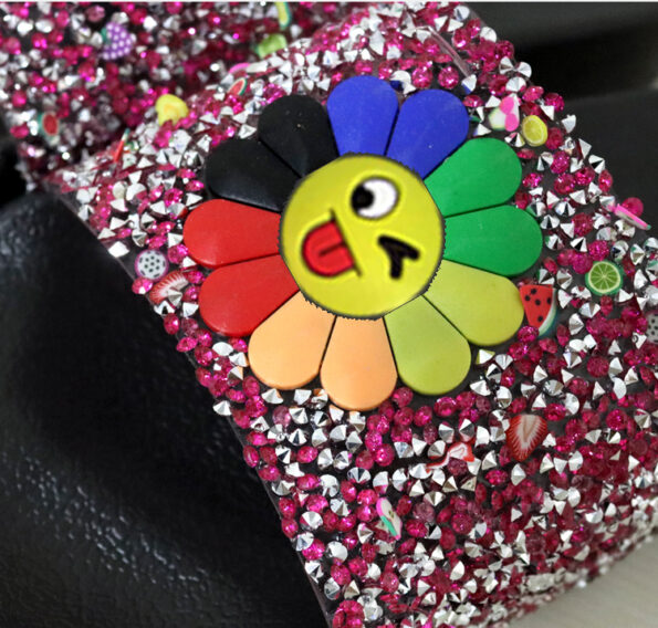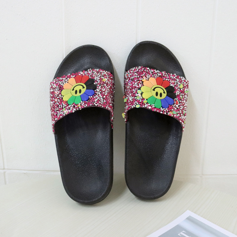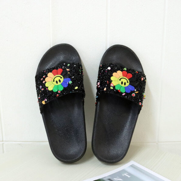 Delicately crafted for comfort and charm, these soft girls’ slippers feature dazzling diamond accents and a vibrant sunflower design. A graceful smiley center and fruits slices adds a touch of whimsy to timeless style.