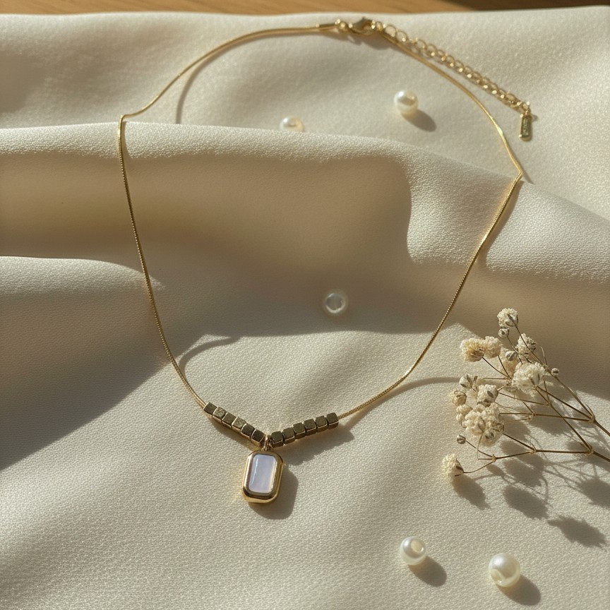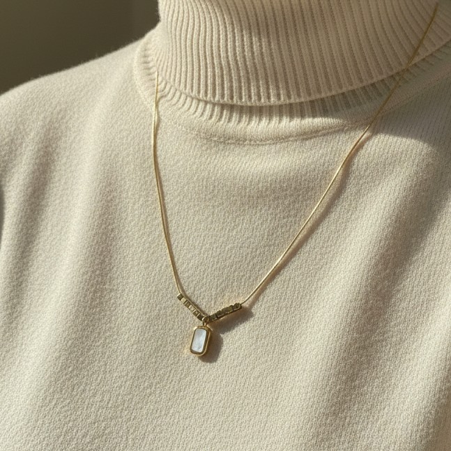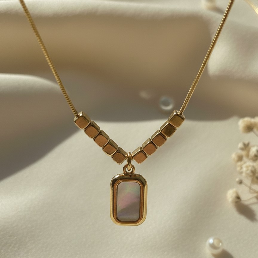 Elevate your everyday wardrobe with this sophisticated gold-toned pendant necklace, designed for the modern minimalist. Featuring a luminous, rectangular mother-of-pearl inlay, this piece captures and reflects light with a soft, ethereal glow.