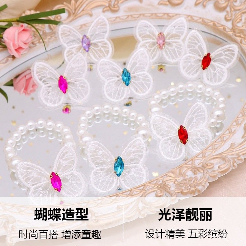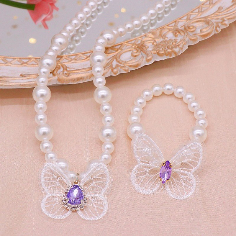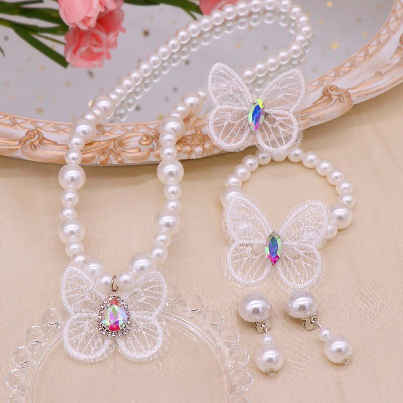 White Fabric Butterfly Pearls Necklace, Bracelet, Earrings & Ring Jewelry Set